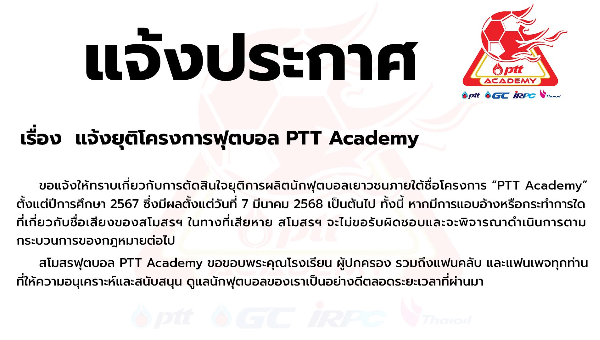 สโมสร พีทีที อะคาเดมี PTT Academy แจ้งยุติโครงการผลิตนักฟตบอลเยาวชนภายใต้ชื่อโครงการ  "PTT Academy "ตั้งแต่ปีการศึกษา 2567 ซึ่งมีผลตั้งแต่วันที่ 7 มีนาคม 2568 เป็นต้นไป
