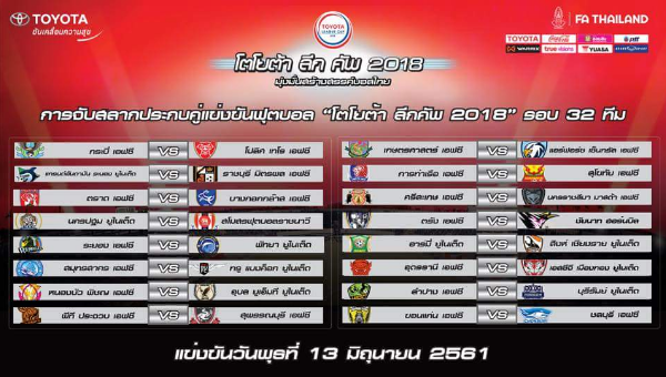 ผลการจับสลากประกบคู่ศึกฟุตบอลถ้วย โตโยต้า ลีกคัพ 2018 รอบ 32 ทีมสุดท้าย เมื่อช่วงบ่ายที่ผ่านมามีดังนี้