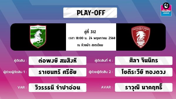 ฝ่ายพัฒนาผู้ตัดสิน สมาคมกีฬาฟุตบอลแห่งประเทศไทย ในพระบรมราชูปถัมภ์ ประกาศรายชื่อผู้ตัดสินที่จะปฏิบัติหน้าที่ในการแข่งขันฟุตบอลเมืองไทย ลีก ฤดูกาล 2024/25 รอบ Play-off