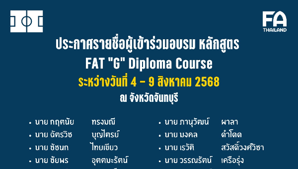 ประกาศ : รายชื่อ ผู้มีสิทธิ์เข้าร่วมการอบรมผู้ฝึกสอน หลักสูตร FA Thailand 'G' Diploma ที่ จันทบุรี และ กระบี่ เดือนสิงหาคม 2568