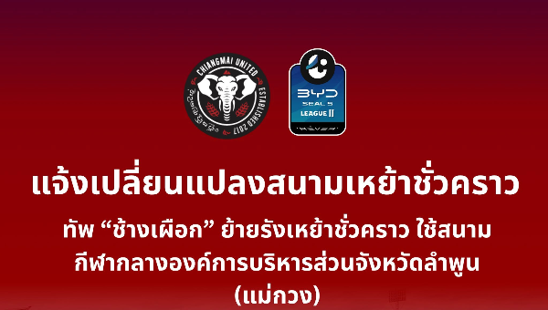 แจ้งเปลี่ยนแปลงสนามแข่งขันในฐานะทีมเหย้าชั่วคราว ของสโมสรเชียงใหม่ ยูไนเต็ด โดยจะทำการแข่งขันที่สนามกีฬากลางองค์การบริหารส่วนจังหวัดลำพูน (แม่กวง) เนื่องจากสโมสรได้ยื่นเรื่องขอใช้สนามกีฬาเทศบาลนครเชียงใหม่เป็นสนามเหย้าเพื่อทำการแข่งขัน "BYD SEAL 5 LEAGUE II" ฤดูกาล 2025/26 แต่สนามกีฬาเทศบาลนครเชียงใหม่อยู่ในขั้นตอนการปรับปรุง ยังไม่สามารถใช้งานได้ ถ้าหากการปรับปรุงแล้วเสร็จ ทัพ “ช้างเผือก” จะย้ายกลับมาใช้สนามกีฬาเทศบาลนครเชียงใหม่เป็นรังเหย้าสู้ศึก "BYD SEAL 5 LEAGUE II" ฤดูกาล 2025/26 ซึ่งสโมสรจะประกาศแจ้งทราบ