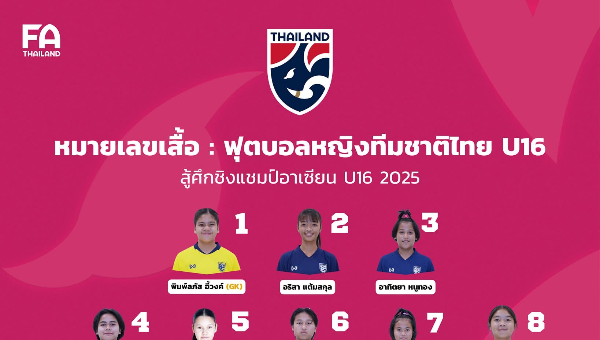 ฟุตบอลหญิงทีมชาติไทยรุ่นอายุไม่เกิน 16 ปี ประกาศหมายเลขเสื้อ นักกีฬาทั้ง 23 คน สำหรับทำการแข่งขันฟุตบอลหญิงชิงแชมป์อาเซียนรุ่นอายุไม่เกิน 16 ปี (2025 ASEAN U-16 Women's Championship) ที่ เมือง สุราการ์ตา ประเทศ อินโดนีเซีย ระหว่างวันที่ 18-29 สิงหาคม 2568 ภายใต้การคุมทัพของ "ธิดารัตน์ วิวาสุขุ"
