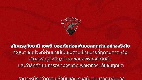 ล่าสุด อุทัยธานี เอฟซี ได้ออกแถลงการณ์ขอโทษแฟนบอล ผ่านทางเฟซบุ๊กแฟนเพจอย่างเป็นทางการ โดยข้อความระบุว่า "สโมสรอุทัยธานี เอฟซี ขออภัยต่อแฟนบอลทุกท่านอย่างจริงใจ ที่ผลงานในช่วงที่ผ่านมาไม่เป็นไปตามเป้าหมายที่ทุกคนคาดหวัง สโมสรรับรู้ถึงปัญหาและข้อบกพร่องที่เกิดขึ้น และกำลังดำเนินการอย่างจริงจังเพื่อหาทางแก้ไขในทุกมิติ"