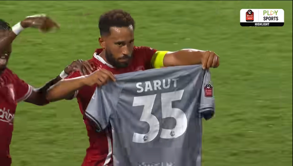 น.19 แอนดรอส ทาวน์เซนด์ ซัดประตูที่สองของเจ้าตัวในไทยลีกด้วยซ้ายคม ๆ ก่อนวิ่งมาดีใจแล้วชูเสื้อของ ศรุต ณะศรี ผู้รักษาประตูมือ 1 ของทีมที่ได้รับบาดเจ็บหนักไปก่อนหน้านี้