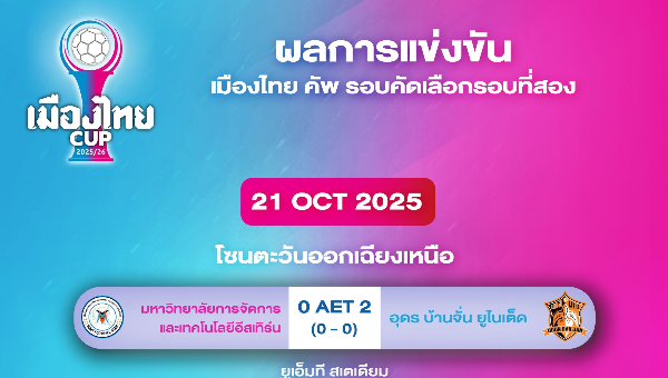 สรุปผล การแข่งขันฟุตบอลรายการ "เมืองไทย คัพ" ฤดูกาล 2025/26 รอบคัดเลือก รอบที่ 2 ในวันที่ 21 ตุลาคม 2568