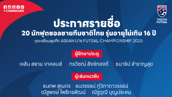 ประกาศรายชื่อ 20 นักฟุตซอลชายทีมชาติไทย รุ่นอายุไม่เกิน 16 ปี เพื่อเก็บตัวฝึกซ้อมและเตรียมแข่งขัน รายการ ASEAN U16 FUTSAL CHAMPIONSHIP 2025