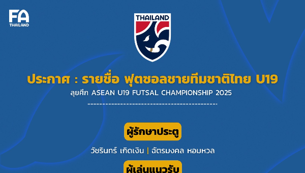 สมาคมกีฬาฟุตบอลแห่งประเทศไทย ในพระบรมราชูปถัมภ์ ประกาศรายชื่อ 14 นักฟุตซอลชายทีมชาติไทย รุ่นอายุไม่เกิน 19 ปี ทำการแข่งขันรายการ ASEAN U19 FUTSAL CHAMPIONSHIP 2025 ระหว่างวันที่ 22-28 ธันวาคม 2568 ณ ยิมเนเซียม อบจ.นนทบุรี