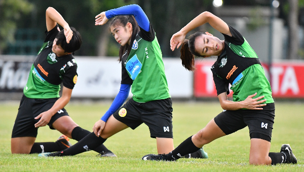 ทีมฟุตบอลหญิงทีมชาติไทยลงฝึกซ้อมก่อนลงอุ่นเครื่องกับเมียนมาร์ โดยโค้ชหนึ่งเตียมลองแทคติคที่จะใช้ในศึกชิงแชมป์อาเซียนบดสาวหม่องในเกมนี้