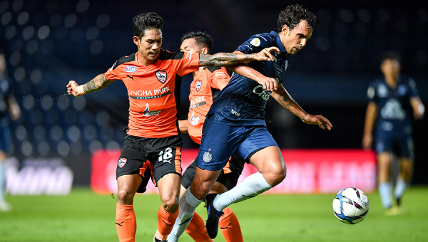 นาทีที่ 17 บุรีรัมย์ ยูไนเต็ด ได้ฟรีคิกระยะน่าลุ้นที่กึ่งกลางสนาม ดิโอโก หลุยส์ ซานโต ได้สืบเท้าเข้าไปยิงเต็มข้อบอลพุ่งสายเฉี่ยวเสาออกหลังไปนิดเดียว