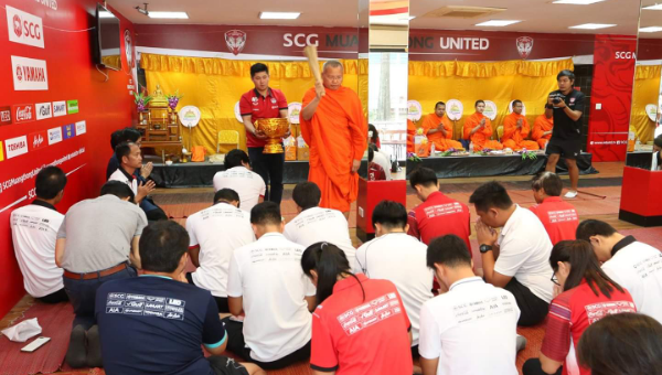 บรรยากาศเป็นไปอย่างเรียบง่าย มีการนิมนต์พระสงฆ์จำนวน 9 รูป จากวัดสระเกศราชวรมหาวิหาร มาร่วมเจริญพระพุทธมนต์ ก่อนจะถวายภัตตาหารเพล, พรมน้ำมนต์ให้กับทางผู้บริหาร, นักเตะ รวมไปถึงเจ้าหน้าที่สโมสรเพื่อความเป็นสิริมงคล ก่อนจะปิดท้ายด้วยการไหว้ศาลพระภูมิของสนาม เอสซีจี