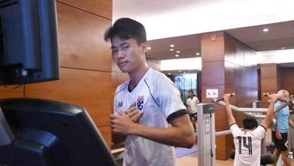 ณ ห้องฟิตเนส โรงแรม คราวน์ พลาซ่า กรุงฮานอย ประเทศเวียดนาม ฟุตบอลชายทีมชาติไทย ซ้อมต่อเนื่องในห้องฟิตเนส เพื่อเตรียมพร้อมร่างกาย สำหรับการแข่งขันฟุตบอลชิงแชมป์เอเชีย รุ่นอายุไม่เกิน 23 ปี รอบคัดเลือก กลุ่ม เค นัดที่สองที่จะพบกับ บรูไน