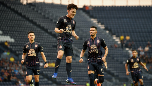 นาทีที่ 45 สุภโชค สารชาติ ได้กระชากบอลจากกลางสนามขึ้นหน้าแล้วจ่ายบอลออกซ้ายให้ ศศลักษณ์ ไหประโคน ได้ยิงด้วยเท้าซ้ายบอลลอยเหินข้ามคานออกหลังไปนิดเดียว