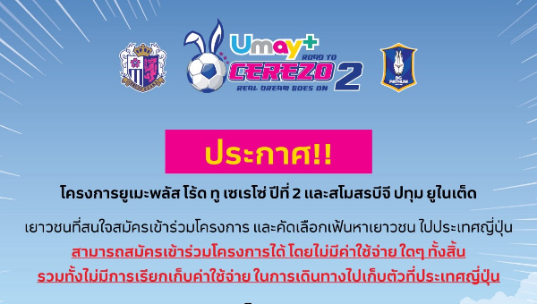 สโมสรขอเรียนว่า โครงการ Umay+ Road to Cerezo เป็นโครงการที่สโมสรจัดขึ้นให้กับเยาวชน โดยคัดเลือกเยาวชนที่มีทักษะในกีฬาฟุตบอลและขาดโอกาส เพื่อพาไปเปิดประสบการณ์ร่วมกับสโมสรเซเรโซ่ โอซาก้า ที่ประเทศญี่ปุ่น โดยไม่มีการเรียกเก็บค่าใช้จ่ายใดๆ ทั้งสิ้น