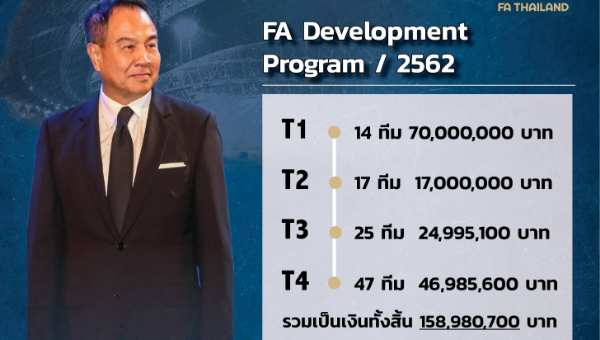 ตามที่ สมาคมกีฬาฟุตบอลแห่งประเทศไทย ในพระบรมราชูปถัมภ์ ได้เปิดให้มีโครงการ FA Development Program ตั้งแต่ปี 2560-2562 เพื่อมอบเงินสนับสนุนเพิ่มเติม ให้แก่สโมสรที่เข้าร่วมการแข่งขันฟุตบอลโตโยต้า ไทยลีก (T1) สโมสรที่เข้าร่วมการแข่งขันฟุตบอล M-150 แชมเปี้ยนชิพ (T2) และสโมสรที่เข้าร่วมการแข่งขันฟุตบอลออมสิน ลีก โปร (T3) และสโมสรที่เข้าร่วมการแข่งขันฟุตบอลออมสิน ลีก (T4) นอกเหนือจากเงินสนับสนุนประจำปี จากสมาคมฯ