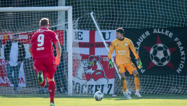 กวินทร์ ธรรมสัจจานันท์ ผู้รักษาประตูทีมชาติไทย เฝ้าเสาในครึ่งหลัง เกมที่โอเอช ลูเวิน แพ้ให้กับ ยูนิโอน เบอร์ลิน แห่งศึกบุนเดสลีกา 1-2 ในเกมอุ่นเครื่องที่อัลกอร์ฟา ประเทศสเปน