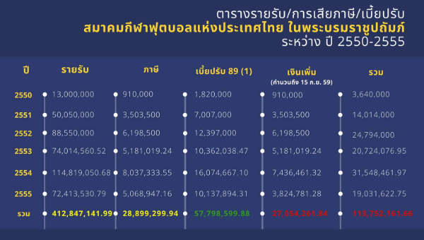 ตามที่ สมาคมกีฬาฟุตบอลแห่งประเทศไทย ในพระบรมราชูปถัมภ์ ได้รับความเสียหายอันเกิดจากการบริหารงานเนื่องจากการค้างชำระภาษีอากร และเบี้ยปรับที่ไม่จดทะเบียนภาษีมูลค่าเพิ่ม ตั้งแต่ปี พ.ศ. 2550 ถึง พ.ศ.2555 ซึ่งในช่วงระยะเวลาดังกล่าวสมาคมมีรายรับจากการให้บริการกับผู้ให้การสนับสนุนตามสัญญาต่างตอบแทนถือเป็นเงินได้ตามมาตรา 40(8) แห่งประมวลรัษฎากร และถือเป็นการให้บริการที่อยู่ในบังคับต้องเสียภาษีมูลค่าเพิ่ม รวมทั้งสิ้น 412,847,141.99 ล้านบาท และต้องเสียภาษีอากร รวมทั้งสิ้น 28,899,299.94 ล้านบาท นั้น