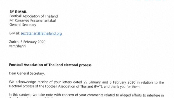 ขอแจ้งให้ทราบว่า เราได้รับจดหมายลงวันที่ 29 มกราคม และ 5 กุมภาพันธ์ 2020 ซึ่งเกี่ยวข้องกับกระบวนการเลือกตั้งของสมาคมกีฬาฟุตบอลแห่งประเทศไทยฯ เป็นที่เรียบร้อย และขอขอบคุณสำหรับจดหมายดังกล่าว
