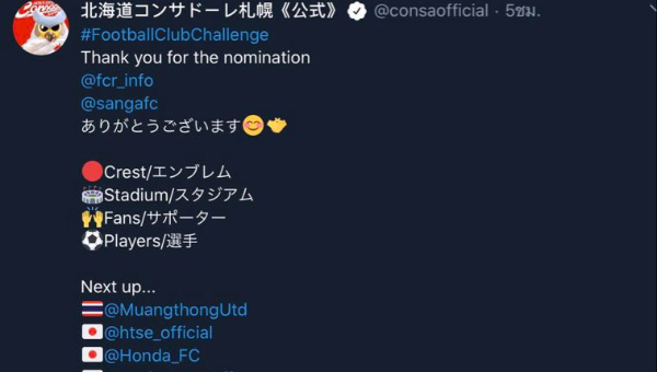ชาลเล้นจ์ดังกล่าวชื่อว่า #FootballClubChallenge โดยให้กิเลนผยองโพสต์ภาพตราสัญลักษณ์สโมสร สนามฟุตบอล กองเชียร์ รวมทั้งบรรดานักเตะ บนแอคเคาท์ทวิตเตอร์ทางการของทีม