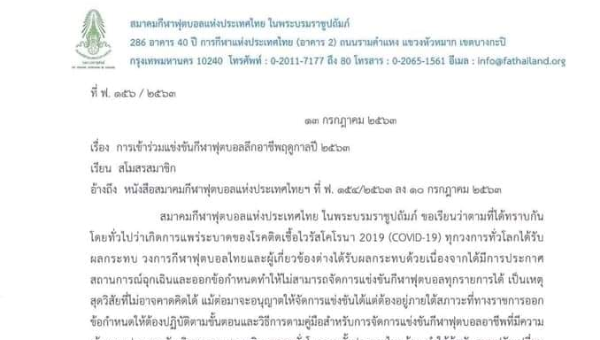 สมาคมกีฬาฟุตบอลฯ ร่อนหนังสือถามทุกสโมสรว่าพร้อมลงเล่นหรือไม่ ภายใต้ข้อแม้เงินสนับสนุนน้อยลงจากสถานการณ์โควิด