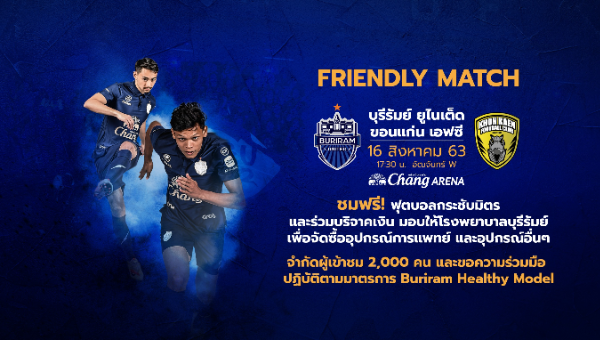 ชมฟรีฟุตบอลกระชับมิตรบุรีรัมย์ ยูไนเต็ด กับขอนแก่น เอฟซี และร่วมบริจาคเงิน มอบให้โรงพยาบาลบุรีรัมย์