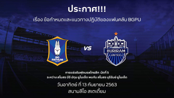 ข้อกำหนดและแนวทางปฏิบัติของแฟนคลับ BGPU การแข่งขันฟุตบอลไทยลีก นัดที่ 5 ระหว่าง สโมสร บีจี ปทุม ยูไนเต็ด พบกับ สโมสร บุรีรัมย์ ยูไนเต็ด วันอาทิตย์ ที่ 13 กันยายน 2563