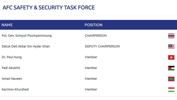 พล.ต.อ. ดร. สมยศ พุ่มพันธุ์ม่วง นายกสมาคมกีฬาฟุตบอลแห่งประเทศไทยฯ ได้รับการแต่งตั้งเป็นประธานคณะทำงานด้านความปลอดภัย ของสมาพันธ์ฟุตบอลแห่งเอเชีย (เอเอฟซี)