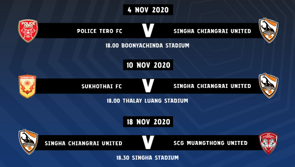 วันพุธที่ 4 พฤศจิกายน 2563 เวลา 18.00 น. สโมสรโปลิศ เทโร เอฟซี พบกับ สโมสรสิงห์ เชียงราย ยูไนเต็ด ณ สนามบุณยะจินดา