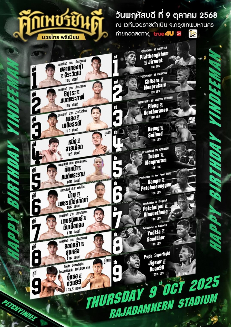 ศึกใหญ่เพื่อฉลองวันเกิดโปรโมเตอร์หนุ่มไฟแรง ‘เสี่ยโบ๊ท ณัฐเดช วชิรรัตนวงศ์’ ในรายการ เพชรยินดี มวยไทยพรีเมี่ยม วันที่ 9 ตุลาคมนี้ ยิ่งทวีความเดือด เมื่ออีกหนึ่งโปรโมเตอร์ดัง ‘เดียร์ เกียรติเพชร’ ขอเติมสีสันแบบจัดหนัก ด้วยการประกาศ ติดปลายนวมพิเศษคู่ละ 500,000 บาท