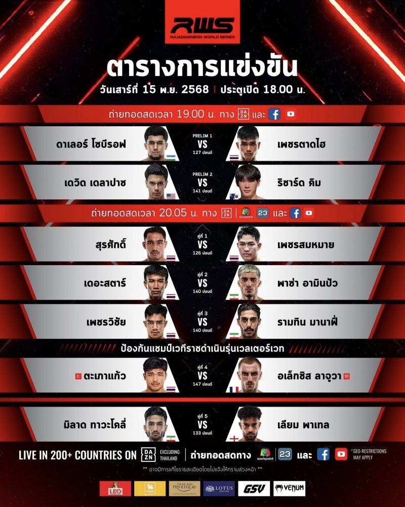 ศึกลดแลกแจกแถม! ราชดำเนิน เวิลด์ ซีรีส์ (RWS) ประจำคืนวันเสาร์ที่ 15 พฤศจิกายนนี้ เตรียมเดือดพล่านทั่วเวที กับการป้องกันแชมป์ที่แฟนมวยห้ามกะพริบตา เมื่อ "ขุนเข่าวัวชน" ตะเภาแก้ว สิงห์มาวิน แชมป์รุ่นเวลเตอร์เวต (147 ปอนด์) ผู้ครองบัลลังก์ RWS จะขึ้นสังเวียนเดิมพันเข็มขัดครั้งที่ 2 เจอกับผู้ท้าชิงชาวฝรั่งเศสฟอร์มร้อนแรงอย่าง "อเล็กซิส ลาจูวา" ที่หมายมั่นปั้นมือจะกระชากแชมป์กลับบ้านให้ได้