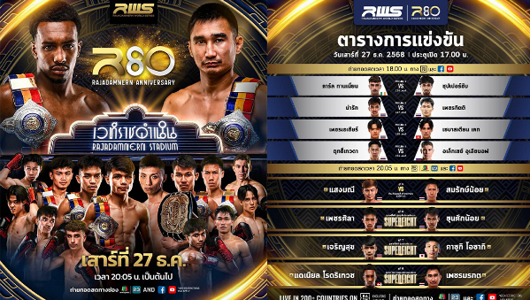 RWS เปิดโผ 8 คู่มวยสุดเดือด เตรียมระเบิดศึกใหญ่ Rajadamnern R80 Anniversary ฉลองครบรอบ 80 ปีสนามมวยเวทีราชดำเนิน วันเสาร์ที่ 27 ธันวาคมนี้ จัดเต็มโบนัสรวมสูงสุดกว่า 8 ล้านบาท แจกทุกคู่ที่ขึ้นสังเวียน