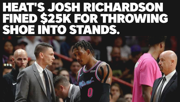 จอช ริเชิร์ดสัน การ์ด ไมอามี ฮีต ถูกปรับ 25,000 เหรียญ สหรัฐฯ โทษฐานทำพฤติกรรมไม่เหมาะสมขว้างรองเท้าแข่งขึ้นบนอัฒจันทร์ในเกมสุดสัปดาห์ที่พ่ายแก่ แอลเอ เลเกอร์ส 97-113 คะแนน