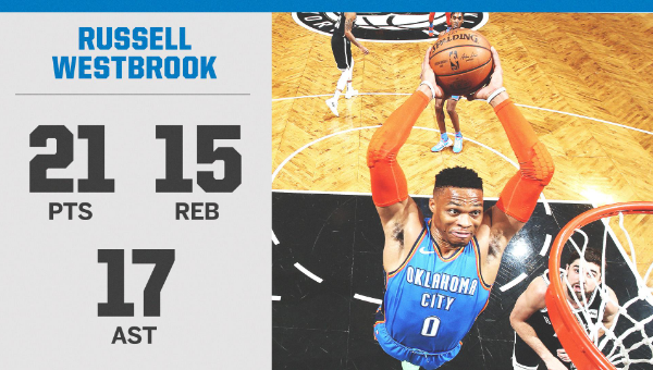 'รัสส์' ทำได้ในเกมที่บุกชนะ บรู้กลิน เน็ตส์ 114-112 คะแนน ทั้งที่เคยตามห่างสุดในเกม 23 แต้ม คว้าชัยต่อเนื่องสี่เกม