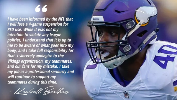 เคนเทรลล์ บราเธอร์ส ไลน์แบ็คเกอร์ของ มินเนโซต้า ไวกิ้งส์ ถูกลีกเอ็นเอฟแอล สั่งแบน 4 นัดแรกของฤดูกาล 2018 เนื่องจากตรวจสารต้องห้ามไม่ผ่าน ในที่นี้คือกัญชา